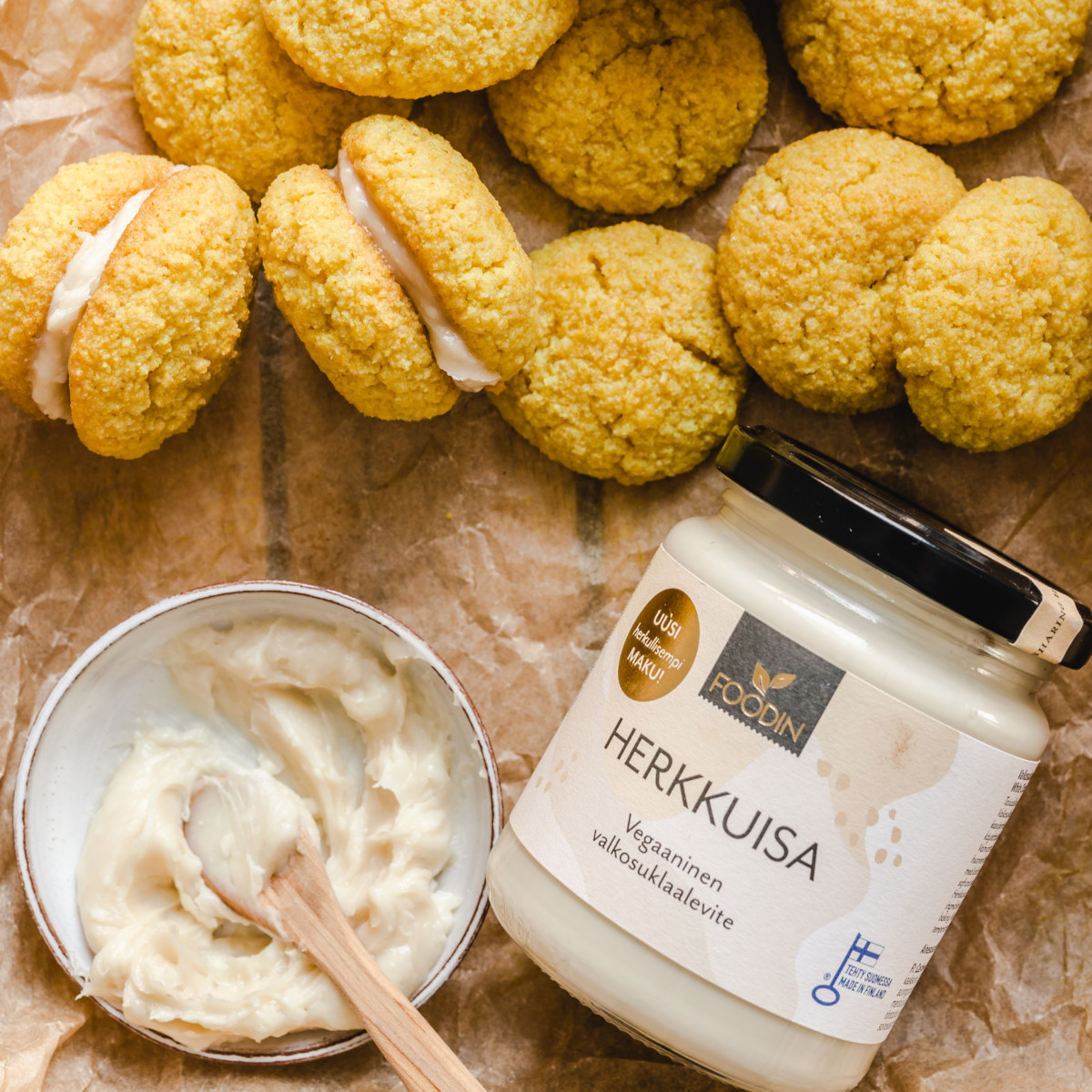 Vinkki: Testaa myös kaakokeksejä lisäämällä kuivien ainesten joukkoon n.0,5 dl Foodin kaakaojauhetta. Tässä tapauksessa voit vähentää sitruunamehun määrää 3 teelusikallisesta ½ teelusikalliseen. Kaakaokeksien väliin sopii valkosuklaa Herkkuisan lisäksi myös hasselpähkinä-raakasuklaa Herkkuisa.