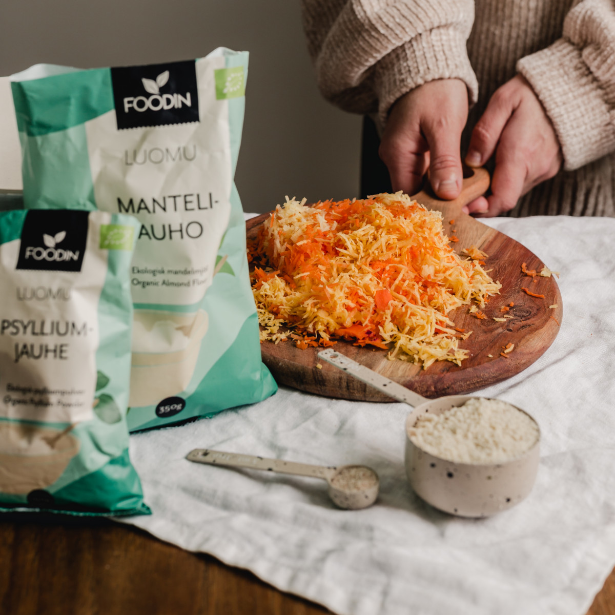Sekoita kulhossa yhteen jauhot, psyllium, suola ja leivinjauhe. Lisää joukkoon porkkanaraaste, sulatettu öljy ja lämmin vesi. Vaivaa taikinaa pari minuuttia ja anna tekeytyä noin 10 minuuttia.