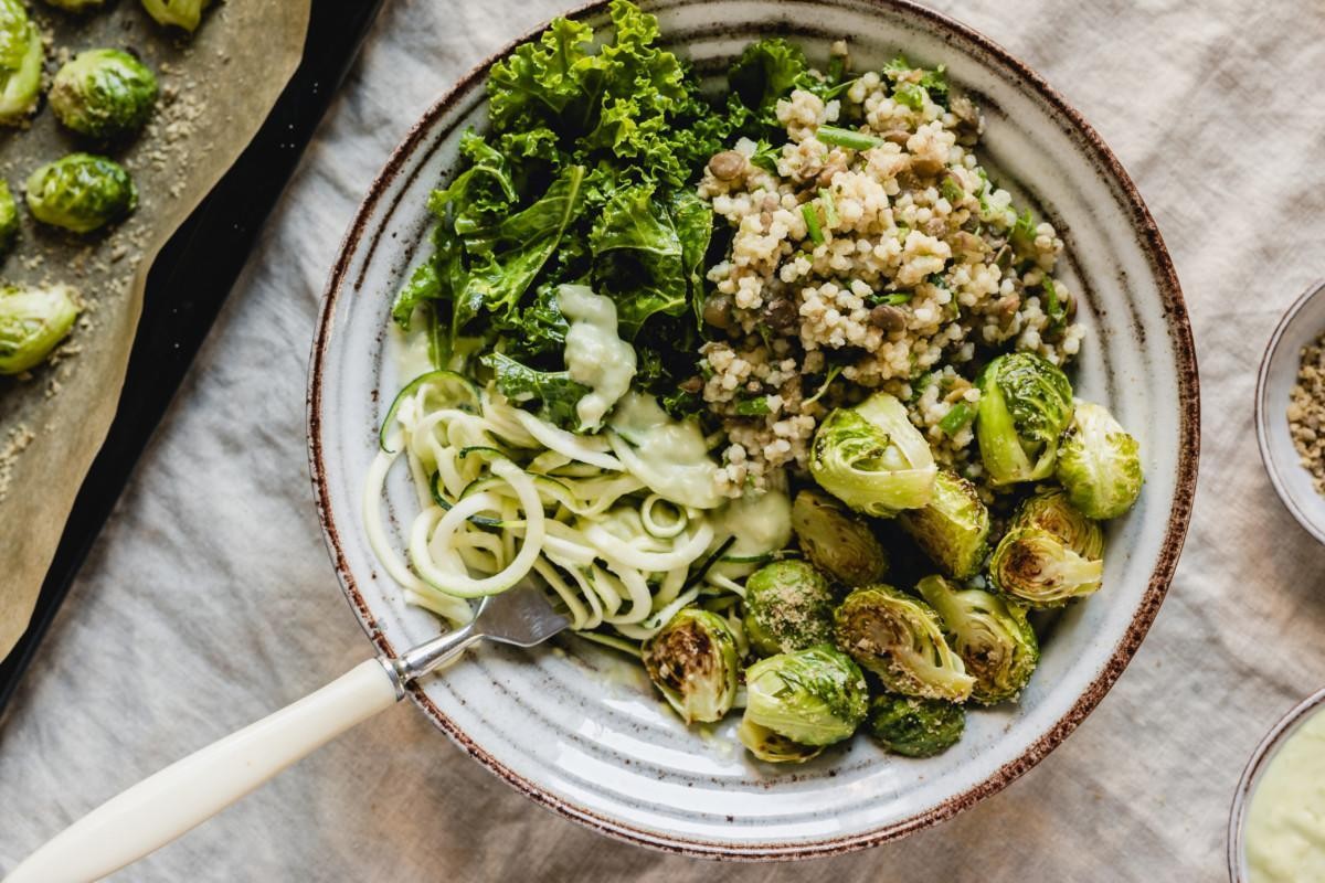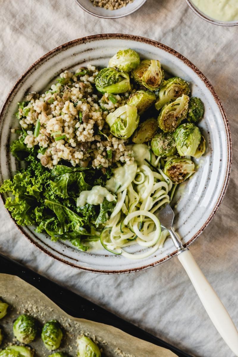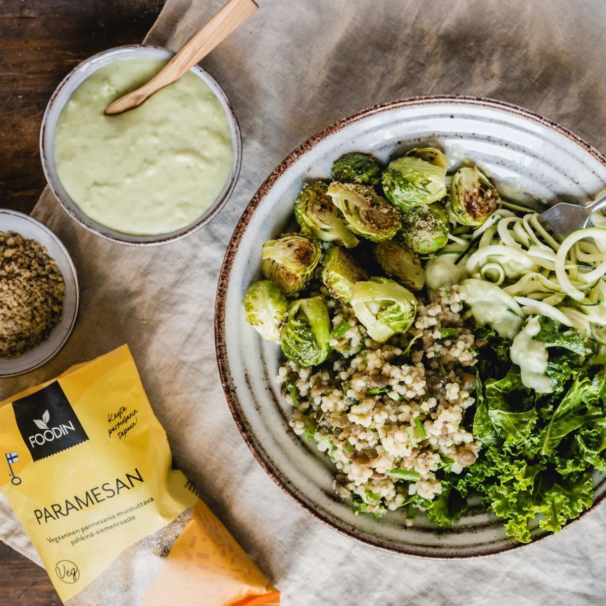Syksyllä kannattaa koota ravitseva bowl kauden vihreistä kasviksista! Testaa uunissa paahdettuja ruusukaaleja, jotka saavat maukkaan suolaisuuden Grana Veganosta. Kotimainen lehtikaali hierotaan pehmeäksi oliiviöljyllä ja sitruunamehulla. Bowlin täyttävyydestä pitää huolta kasvisten lisäksi hirssi, vihreät linssit ja täyteläinen avokadokastike.