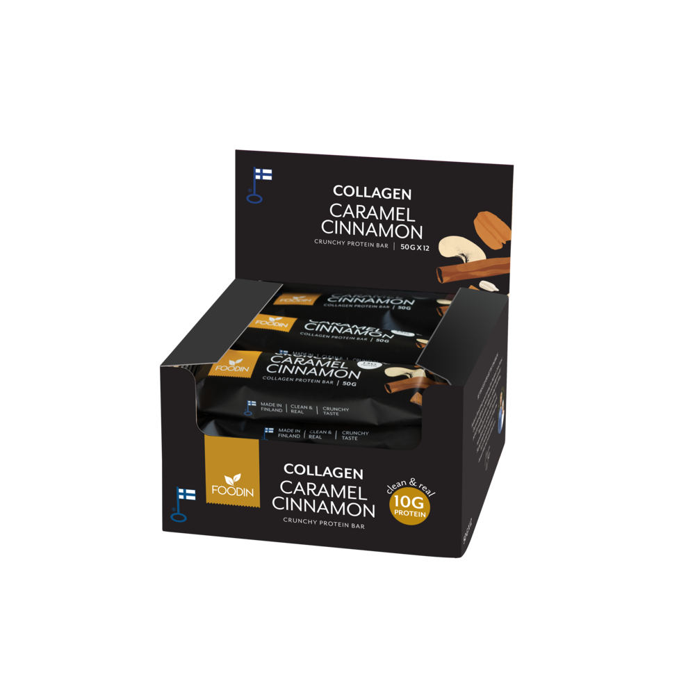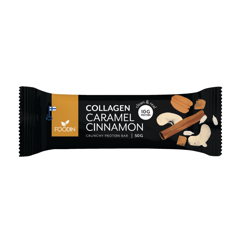 Kollageeni on ihmisen elimistössä eniten esiintyvä proteiini, jonka tuotanto alkaa luonnollisesti vähenemään noin 25 vuoden iässä. Kollageenia esiintyy esimerkiksi ihossa, luustossa, jänteissä ja rustoissa. Se on oleellinen osa kehon toimintaa sekä ihon kimmoisuutta. Kollageenin merkitys ja suosio on kasvanut, kun asiakkaat hakevat uusia vaihtoehtoja kokonaisvaltaiseen kehon hyvinvoinnin tukemiseen. Etsitpä sitten nopeaa energialähdettä urheilusuorituksen aikana, terveellistä välipalaa nuorisolle koulupäiväksi tai laadukasta energiapitoista välipalaa työpäivääsi, kollageeniproteiinipatukkamme ovat täydellinen vaihtoehto!