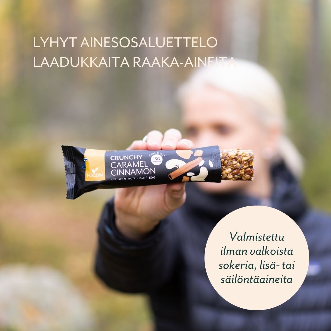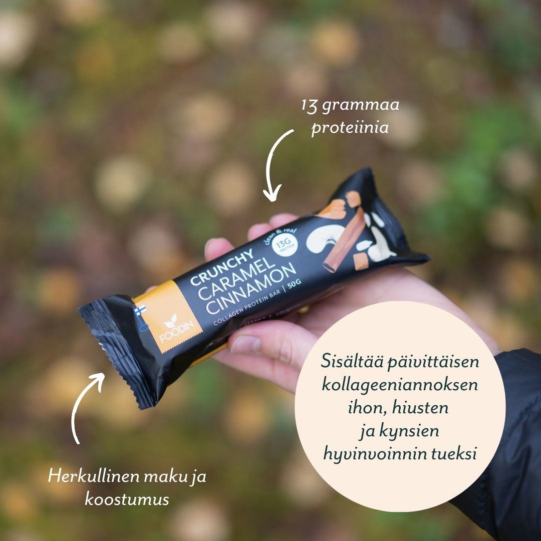 Kollageeniproteiinipatukat ovat olleet jo pitkään valikoimamme kärkituotteiden joukossa, eikä suotta! Foodinin kollageeniproteiinipatukat ovat uniikki, uudenlainen vaihtoehto perinteiselle proteiinipatukalle. Muun muassa pähkinöistä, siemenistä ja kollageeniproteiinista valmistetut proteiinipatukat ovat koostumukseltaan rouskuvia ja granolamaisia, eikä niissä ole proteiinipatukoille tyypillistä sitkeyttä. Patukat ovat maidottomia sekä lisä– ja säilöntäaineettomia.