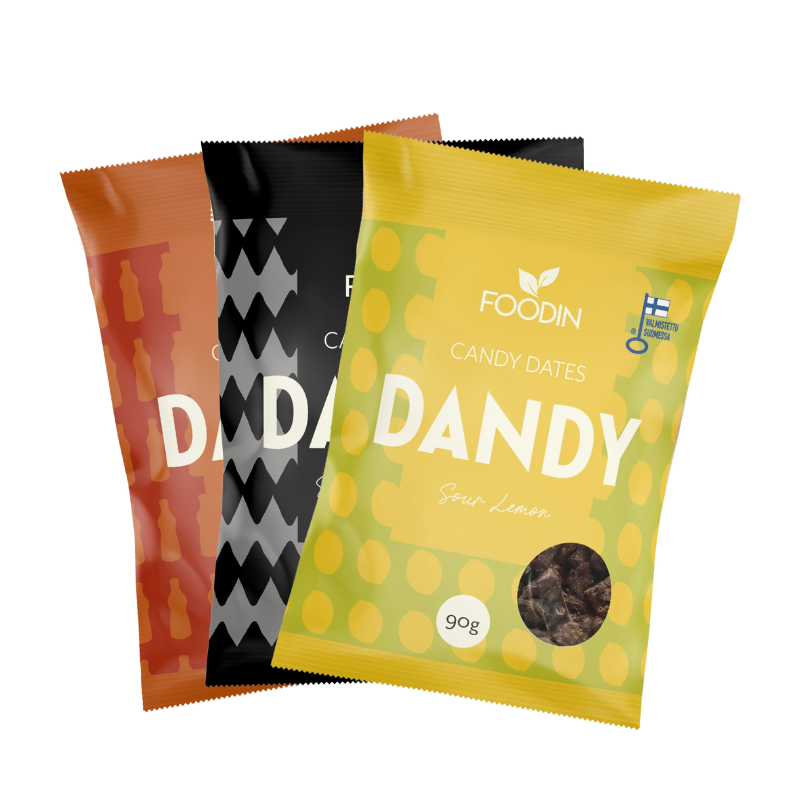 Resepti karkkitaateleiden takana on hämmästyttävän yksinkertainen – vain muutama luonnon raaka-aine. Dandy Candyt ovat osoitus siitä, että herkutella voi fiksummin ja mistään tinkimättä. Päinvastoin – Dandyt ovat parempaa kuin karkki! Dandy Candy -karkkitaatelit valmistetaan Suomessa Vaajakosken tehtaalla ilman valkoista sokeria, palmuöljyä, tai keinotekoisia makeutus- ja väriaineita. Makeutensa karkkitaatelit saavat taatelista.