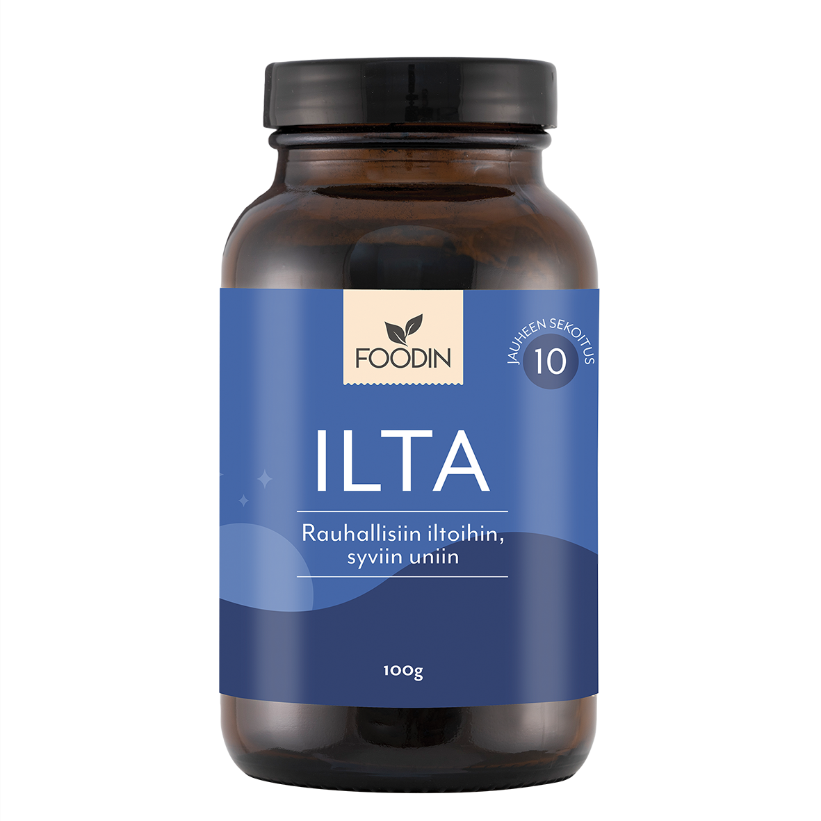 Ilta-jauhesekoitus sisältää sitruunamehujauhetta, tauriinia, L-tryptofaania, magnesiumbisglysinaattia, sitruunamelissaa, kamomillaa, L-teaniinia, aswagandhauutetta, fykosyaniinia sekä B6-vitamiinia. Suositeltu vuorokausiannos on 1-2 teelusikallista illan viimeisen vesilasillisen kanssa.