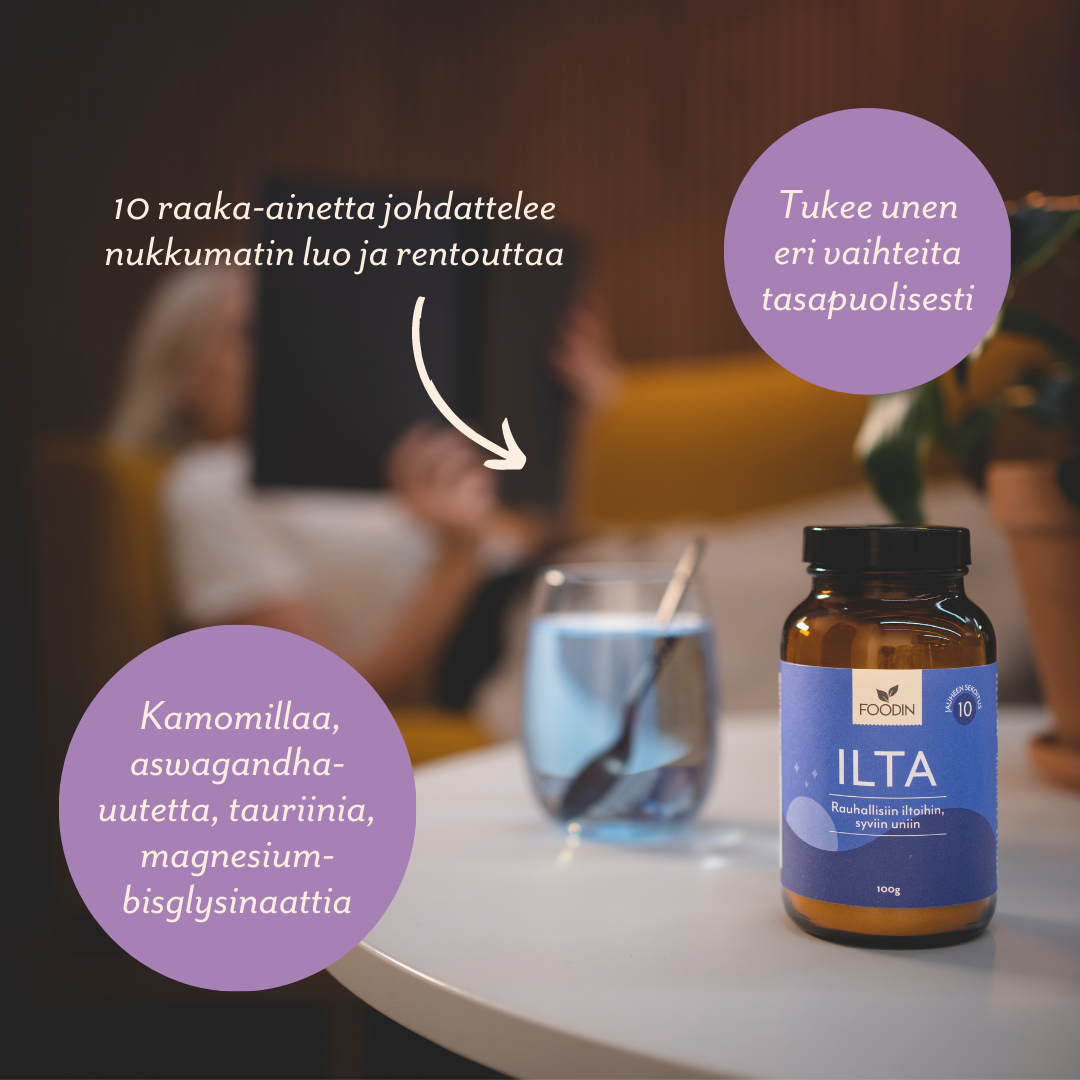 “Viime vuosien varrella on noussut enenevissä määrin pintaan ihmisten kaipuu kokonaisvaltaisempaan “illan viimeiseen shottiin”. Ilta on sekoitus, jossa tiivistyy kymmenen tarkoin valikoitua raaka-ainetta rentouttamaan illan viimeisiä hetkiä ja tukemaan tasapuolisesti unen eri vaiheita”, kertoo Jaakko Halmetoja tuotekehityksestä.